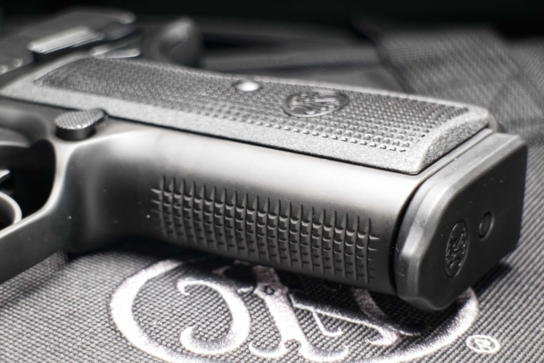 L’impugnatura presenta uno sperone modificato, che con il cane ad anello elimina il “morso” del cane, e ha la parte anteriore e il dorsalino zigrinati per una migliore presa. L’obsoleta e inutile sicura al caricatore è stata eliminata dal progetto, mentre la capacità del caricatore è stata portata al passo dei tempi, aumentandola da 13 colpi (difficilmente “alta potenza” al giorno d’oggi) a 17 colpi.